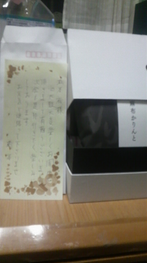 今日家に帰って、ポストを見たら…宅急便の不在票が入っていました。早速、電話して再配達してもらいました…なんと初めて太鼓を見に来て下さった、我輩の家を買った不動産屋の社長さんからの送りものでした、中みはかりんとの詰め合わせでした。ありがとうございます…って、中にお手紙が…和太鼓大変楽しくお聞きかせ頂きまして、有り難うございました。次会も是非とも行きたく楽しみにしております。…と書いて頂いていました。良かった、来て頂いてたんですね。もう、家を買って25年がたちます…今も当時と同じようにお付き合いして頂いています。前は、社員さんの1人だった方が、今はそこの社長さんです。他の方は辞めたり、他店へと…そこで、1人頑張られ今の地位に…素晴らしい方です。
